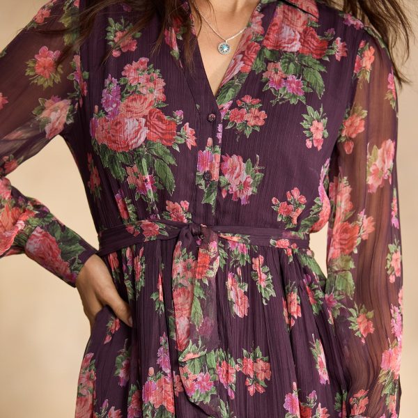 All the beauty of a garden in bloom comes to life on our easy. crinkle printed dress with two stylish tiers. covered buttons at the sleeve cuffs. removable tie at the collar and covered eyelet button front. Fully lined. side seam pockets. Viscose. Hand wash. Imported. Exclusive. Sizes XS (0?C2). S (4?C6). M (8?C10). L (12?C14). XL (16?C18). XXL (20?C22). Approx. 37l.
