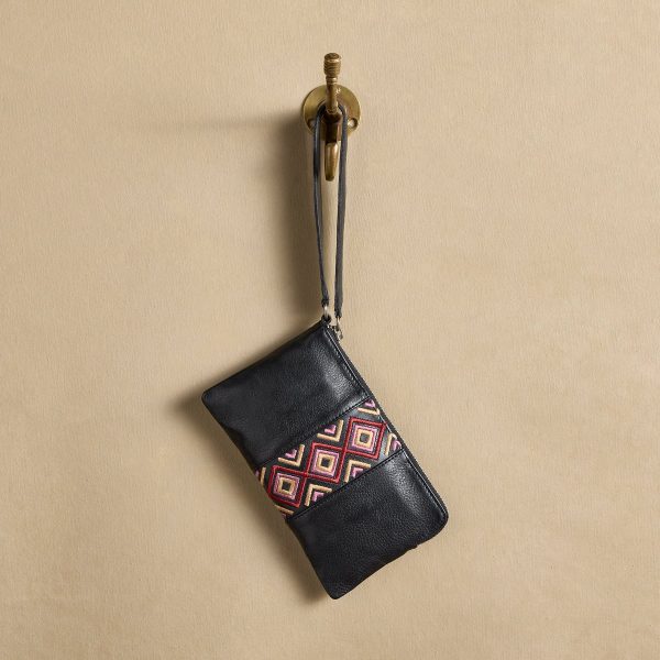 Handcrafted in small batches by skilled craftspeople. the Chamiso Zippered Pouch is made of full-grain leather embellished with embroidered ribbon. Chic and compact. with a wristlet strap. it carries your phone. cards and cash in style. Zip top. one interior pocket and four card slots. Imported. Approx. 8l x .5d x 4.5h.