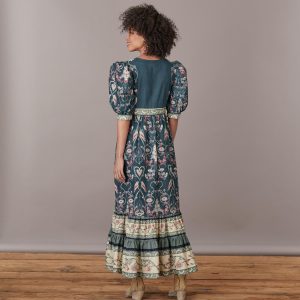 Enjoy the peaceful hues and enchanting silhouette of this handcrafted. tiered dress with fanciful bird print. contrast border. and banded cuffs. Lined. V-neck bodice and side zipper closure. Cotton. Handwash. Imported. Exclusive. XS (0-2). S (4-6). M (8-10). L (12-14). XL (16-18). XXL (20-22). Approx. 54l.