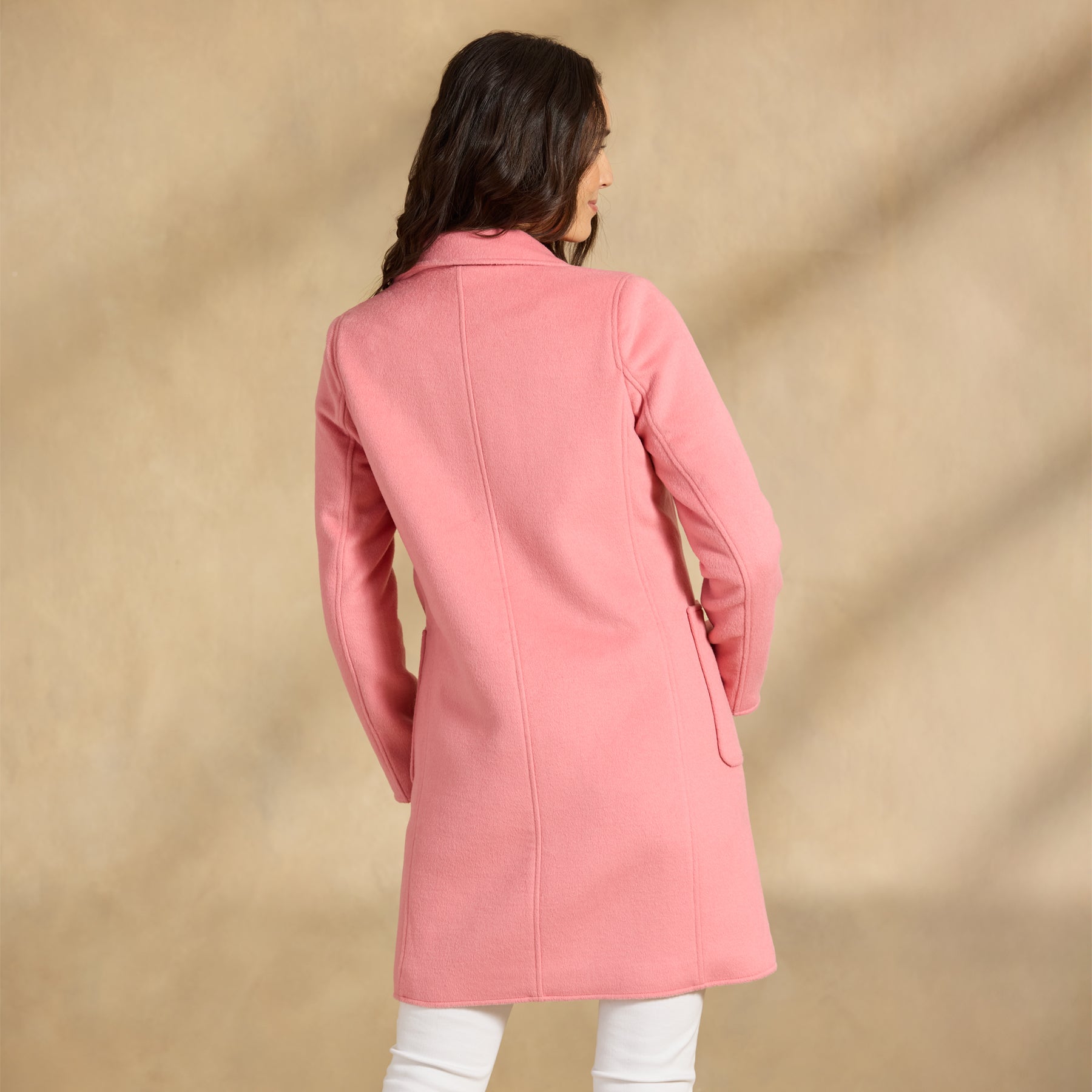 Stylish and bold. our stunning double breasted topper in menswear inspired pinstripes boasts two patch pockets and a contrast print lining. Polyester/wool. Dry clean. Imported. Exclusive. Sizes XS (0?C2). S (4?C6). M (8?C10). L (12?C14). XL (16?C18). XXL (20?C22). Approx. 36l.