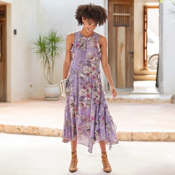A gorgeous floral print enchants on our romantic dress. with angled. fluttery ruffles. asymmetrical hem. deep side slit. smocked neckline and keyhole button back. Fully lined. Viscose. Machine wash. Imported. Exclusive. Sizes XS (0-2). S (4-6). M (8-10). L (12-14). XL (16-18). XXL (20-22). Approx. 43.5l.