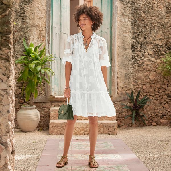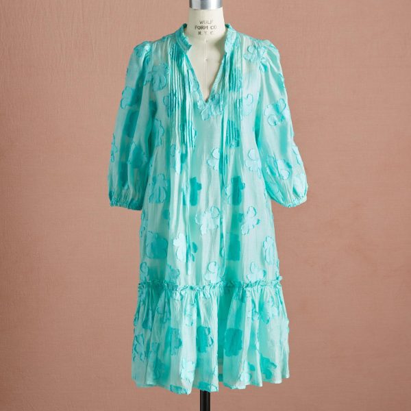 Make a statement in our stunning. easy popover jacquard dress with notch neckline and lovely ruffle detail. pintucking at the center front for a feminine touch and puff sleeves with encased elastic cuffs. Ruffle tiered hem. Cotton/Viscose/Nylon. Machine wash. Imported. Exclusive. Sizes XS (0-2). S (4-6). M (8-10). L (12-14). XL (16-18). XXL (20-22). Approx. 38l.