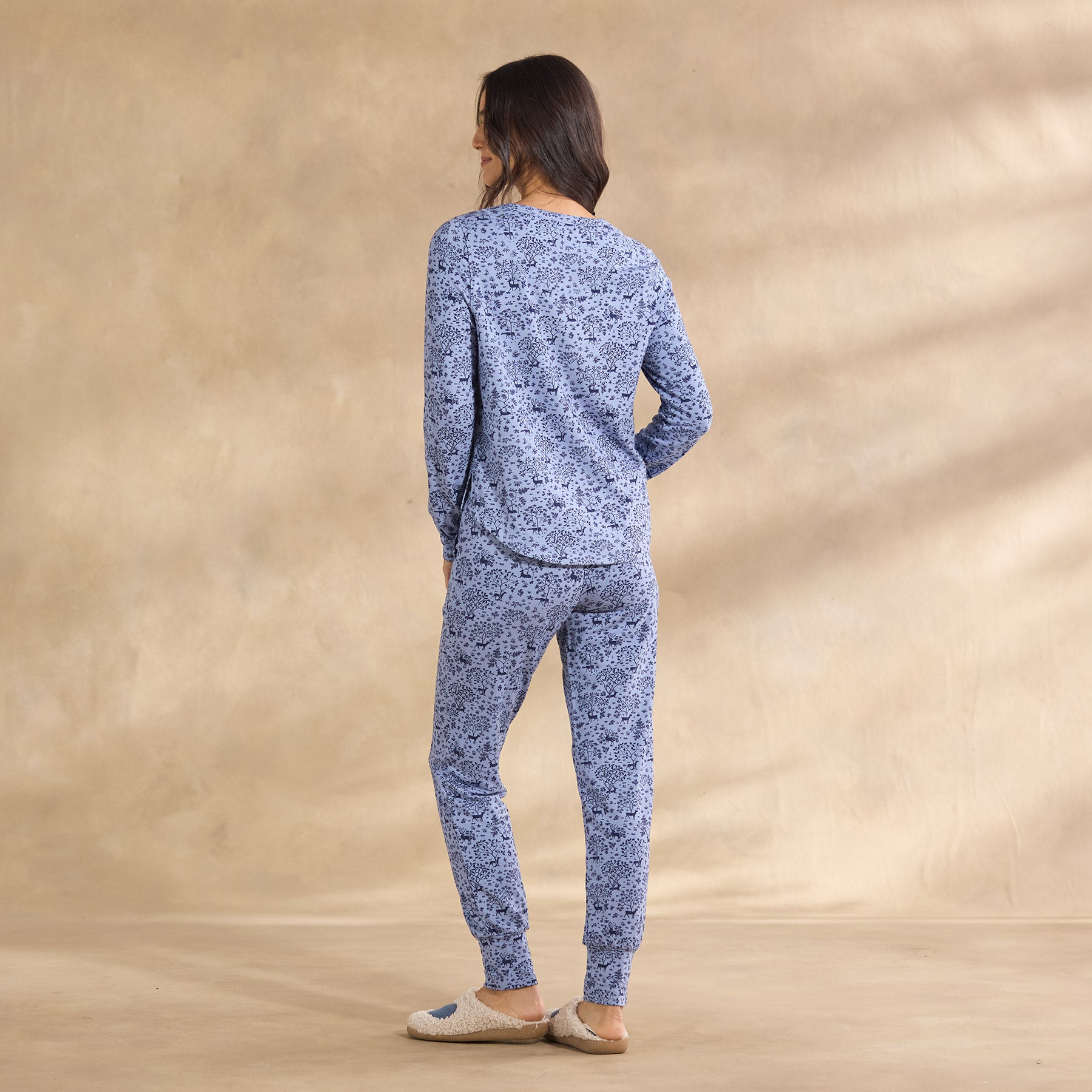 The softest. printed French terry pajama set of the highest quality. with scoop neck. shirttail hem. side notches and velvet trim at back neck. Bottoms have elastic waist. two pockets and twill drawstring. Ready for gifting. the set comes in a printed bag with velvet ties. Rayon/spandex. Machine wash. Imported. Exclusive. Sizes XS (0??). S (4??). M (8??0). L (12??4). XL (16??8). XXL (20??2). Top approx. 24.5l. Bottoms 29 inseam.