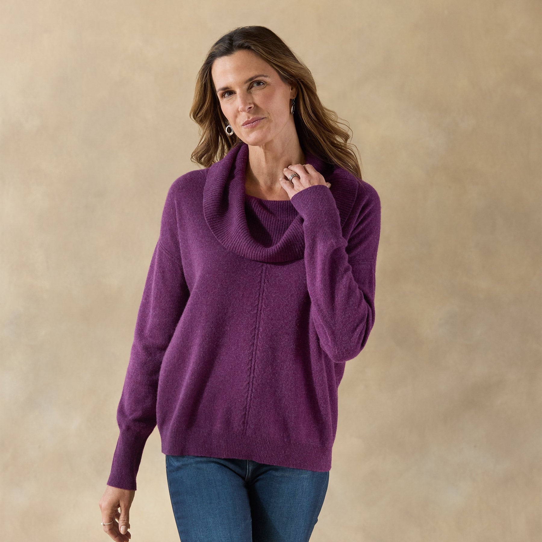 The coziest cowlneck sweater in lofty cashmere. with a ribbed cowl and sleeves. cable stitch detail at center front and back. and rib transfer details at armholes. Easy fit. Hand wash. Imported. Exclusive. Sizes XS (0??). S (4??). M (8??0). L (12??4). XL (16??8). XXL (20??2). Approx. 24l.