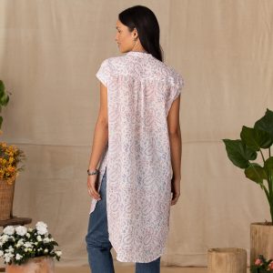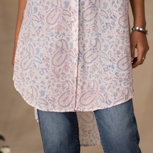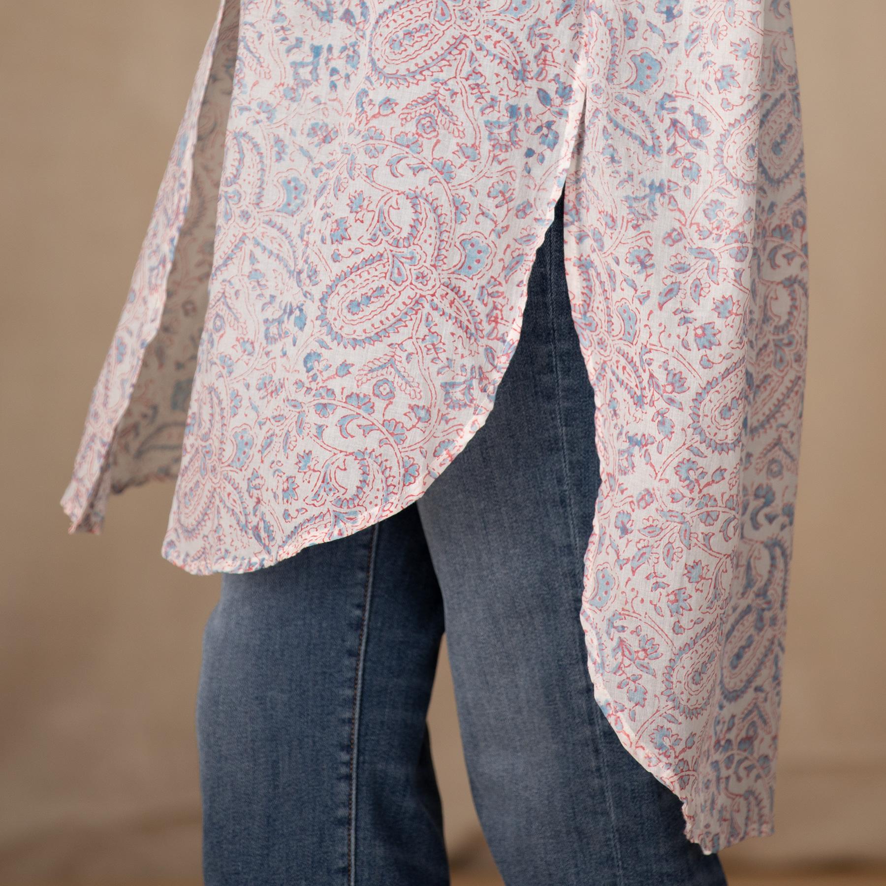 This button-down. sheer tunic is made of fine. handprinted cotton in a paisley print and makes a beautiful cover-up. Hi-lo hem. Cotton. Machine wash. Imported. Exclusive. Sizes XS (0 to 2). S (4 to 6). M (8 to 10). L (12 to 14). XL (16 to 18). XXL (20 to 22). Approx. 36L front. 42L back.