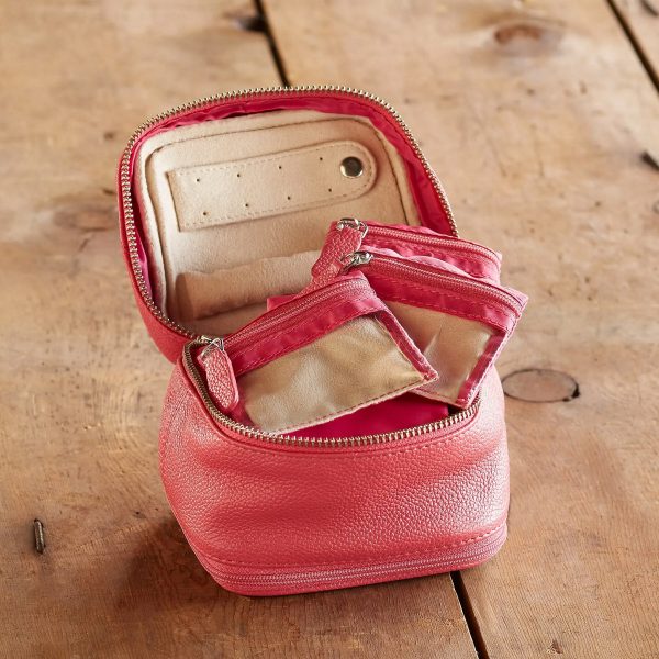 Uniquely hers. a leather jewelry case personalized with her initial and offering safe storage??six pockets in all??for precious trinkets and jewels. Microsuede lining. Zip closure. Exclusive. Approx. 4.75w x 4.5d x 4.5h. Choose to personalize it with a lowercase letter or leave it blank.