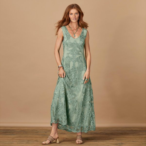 Easy fit-and-flare maxi dress with soft V-neck. Beautiful soutache styling with embroidered mesh. scalloped hem. cap sleeves. Fully lined. Nylon. Hand wash. Imported. Exclusive. Sizes XS (0-2). S (4-6). M (8-10). L (12-14). XL (16-18). XXL (20-22). Approx. 56l.