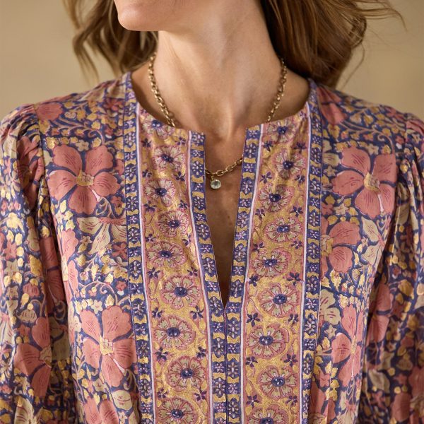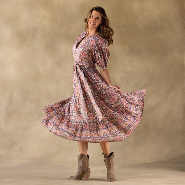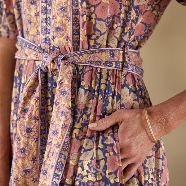 This handcrafted maxi dress features a metallic floral print with contrasting border print. elbow-length puff sleeves. a pull-over style and a self-tie belt. Cotton. Machine wash. Imported. Sizes XS (0?C2). S (4?C6). M (8?C10). L (12?C14). XL (16?C18). XXL (20?C22). Approx. 54l