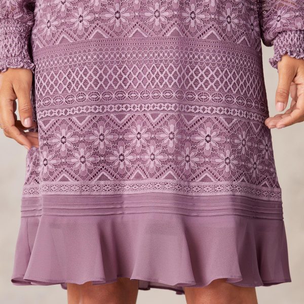 You’re a vision in our allover lace shift dress with chiffon pintuck detail. Flounce hem. tasseled neckline ties. smocked cuffs and full sleeves. Popover styling with separate slip. Nylon. Hand wash. Imported. Exclusive. Sizes XS (0-2). S (4-6). M (8-10). L (12-14). XL (16-18). XXL (20-22). Approx. 38.5l.