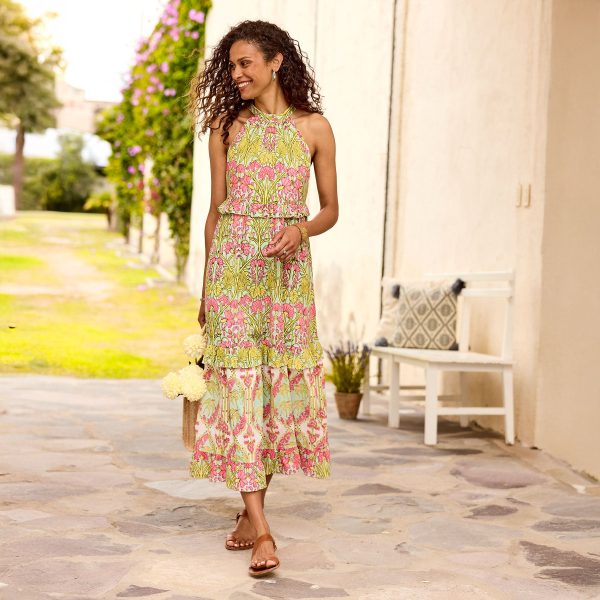 Enjoy the everyday in relaxed style with this halter neck dress with tropical inspired abstract hand blocked prints. Keyhole back with tie closure. two tiers with ruffle details. Cotton. Hand wash. Imported. Sundance exclusive. Sizes XS (0-2). S (4-6). M (8-10). L (12-14). XL (16-18). XXL (20-22). Approx. 49.5l.