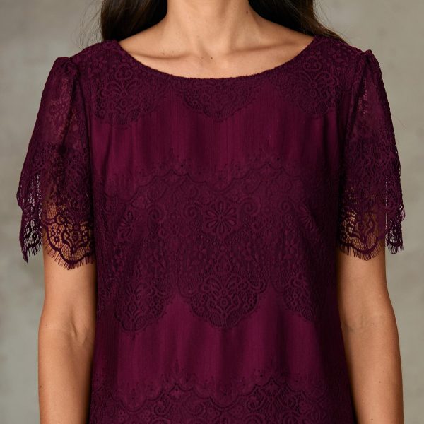Embroidered lace shift dress with alluring deep back V with zipper. scalloped sleeves and hem. Fully lined. Nylon. Hand wash. Imported. Exclusive. Sizes XS (0-2). S (4-6). M (8-10). L (12-14). XL (16-18). XXL (20-22). Approx. 38l.