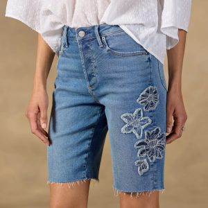 The softest denim bermuda shorts. elevated with artful floral applique??and frayed just so! Cotton/polyester/spandex. Machine wash. cold. Imported. Sundance exclusive. Sizes 24?C32. Approx. 9 inseam; 11 rise; 20 leg opening.