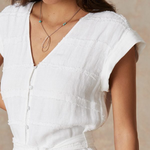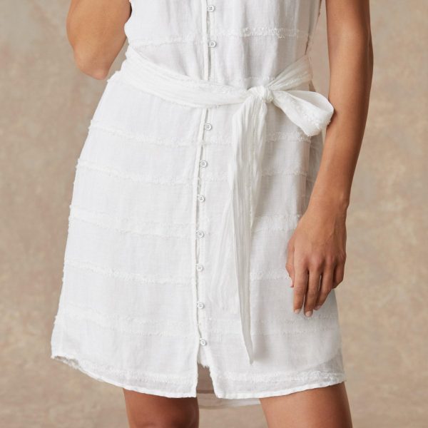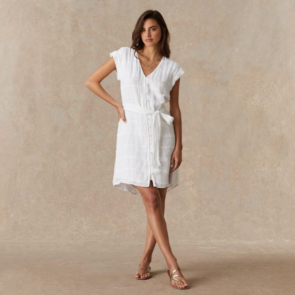 This flirty. wear-anywhere dress is handcrafted and features a button-down style. subtle stripe and self tie. Linen/rayon/cotton. Machine wash. Sizes XS (0-2). S (4-6). M (8-10). L (12-14). Approx. 37l.