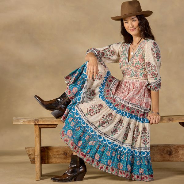 A love letter to bohemian style. our Peacock Flare Midi Dress is full of special details??including handcrafted stitching on the bodice. pretty puffed sleeves and a bouquet of complementary floral prints spanning three twirly tiers. Popover with drawstring. Cotton. Hand wash. Imported. Sizes S/M (0?C6). M/L (8?C12). XL (14?C18). Approx. 46l.