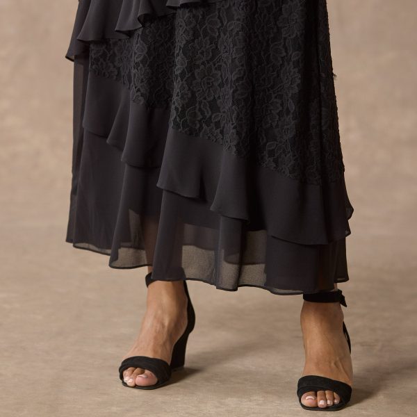This beautiful. mesh lace dress has chiffon ruffle accents throughout and features ruffle feather sleeves. a v-neck front and back with eyelash trim and back zipper. Fully lined. CONTENT. CARE. Imported. Sizes XS (0-2). S (4-6). M (8-10). L (12-14). XL (16-18). XXL (20-22). Approx. XXl