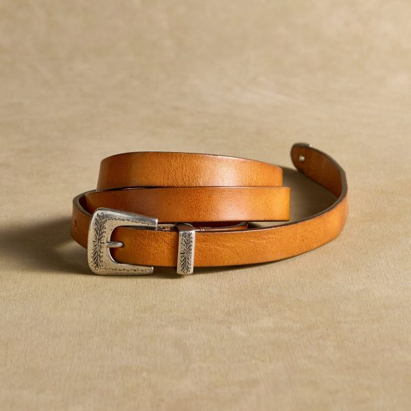 Everything you want to dress up your everyday look; a thin leather belt with textured edging detail and a dappled silver metal buckle and tip. Handcrafted in Italy. Exclusive. Sizes XXS (29.5). XS (31.5). S (33.5). M (35.5). L (37.5). Approx. .78w.