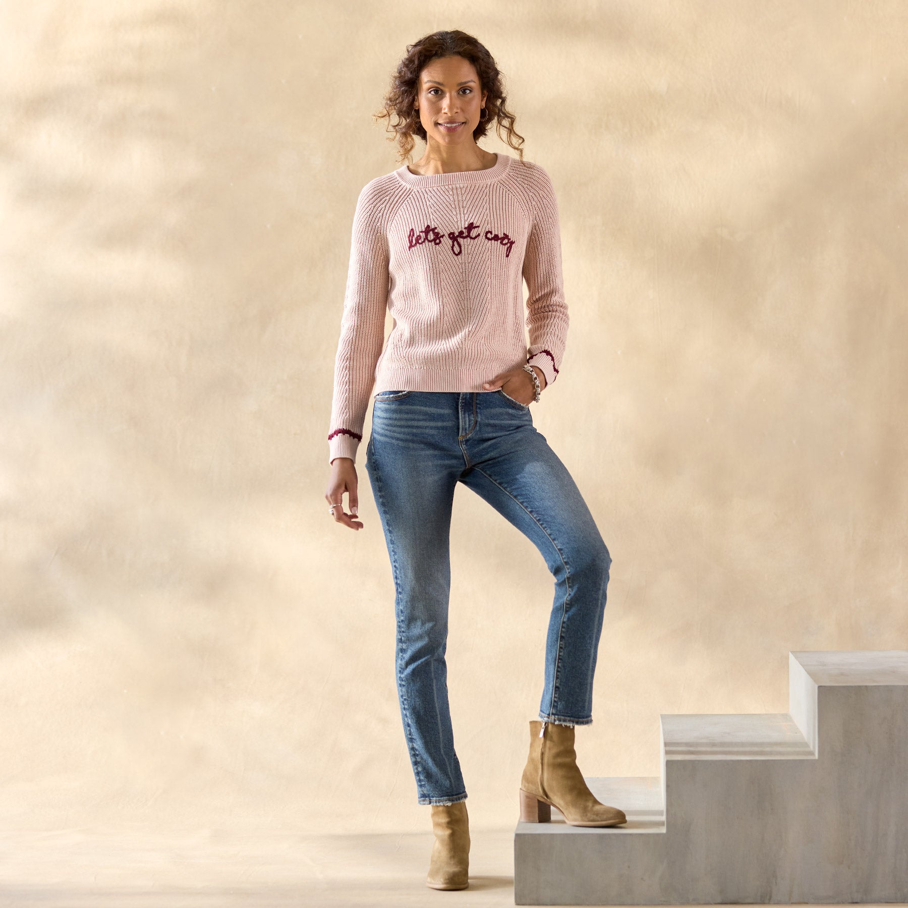 Our fabulously festive rib stitch sweater celebrates the winter season in textural beauty. with acid-washed color. hand-crocheted cuff details. embroidered sentiment. rib trim and crewneck. Simple and sassy. Combed cotton/nylon. Hand wash. Imported. Exclusive. Sizes XXS (00). XS (0–2). S (4–6). M (8–10). L (12–14). XL (16–18). XXL (20–22). Approx. 20.5l.
