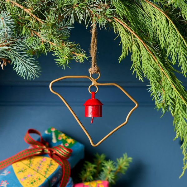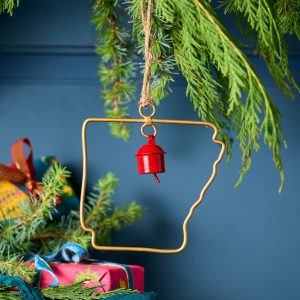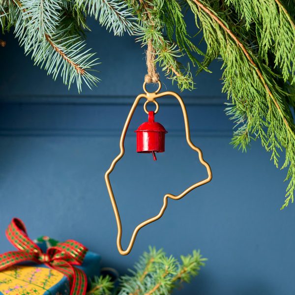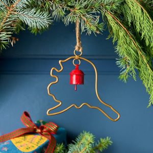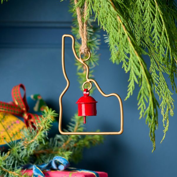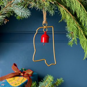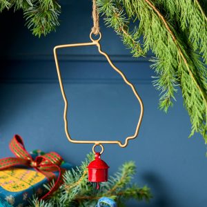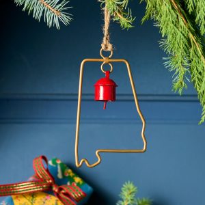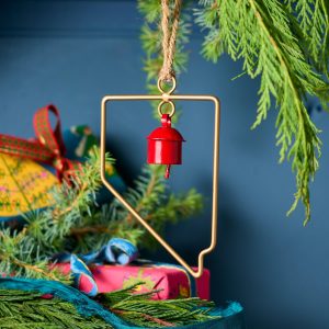 Represent your favorite state on the tree this year with a handcrafted ornament outlined and shaped to artisan perfection. Each U.S. state shape is intricately created and includes an expertly crafted and tuned bell. All 50 states available. Brass/iron/jute. Imported. Exclusive. Sizes vary depending on which state shape is chosen. range from 2w to 4.75w x 2l to 4.75l.