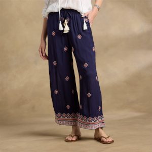 Easy. breezy cropped pants embellished with cut-out detailing and embroidery at hem. Smocked. elastic waistband with braided ties. Cotton. Machine wash. Imported. Sizes XS (4). S (6). M (8?C10). L (12). XL (14). XXL (16). 26 inseam.