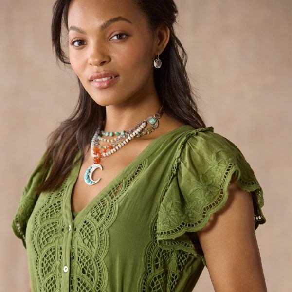 Allover embroidery and soft eyelet tiers add the most feminine touch to our sophisticated V-neck dress with scalloped ruffles at the sleeves. button front placket and a removable belt. Separate slip included. side seam pockets. Cotton. Hand wash. Imported. Exclusive. Sizes XS (0?C2). S (4?C6). M (8?C10). L (12?C14). XL (16?C18). XXL (20?C22). Approx. 49l.