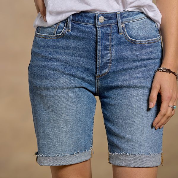 These broken-in shorts with a raw hem and just-so fading will become an indispensable part of your warm-weather wardrobe. Cotton/spandex. Machine wash. Imported. Exclusive. Sizes 24 to 32. 9 inseam. 11 rise. 18-1/2 leg opening.